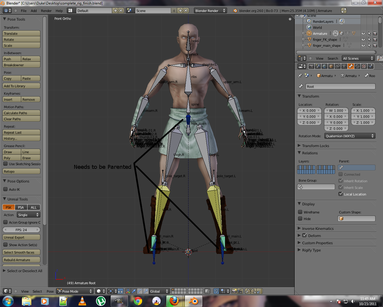 Now, to export this skeletal-mesh to udk, we need to parent all UN-pareneted bones to our freshly added Root bone (which is handy in moving all of the mesh & armature at a time). following bones should be parented.